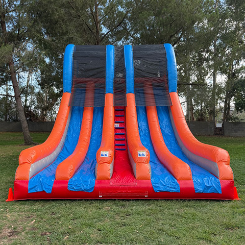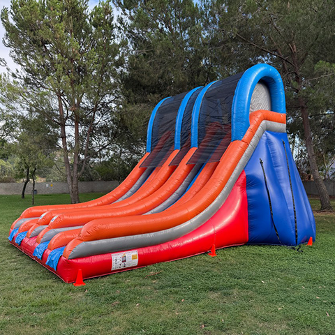 The Quatro 4 Lane Slide is expected to arrive around Oct 15th. Book it for backyard parties this fall—TSSA certification in progress, available for public events by approx. November.